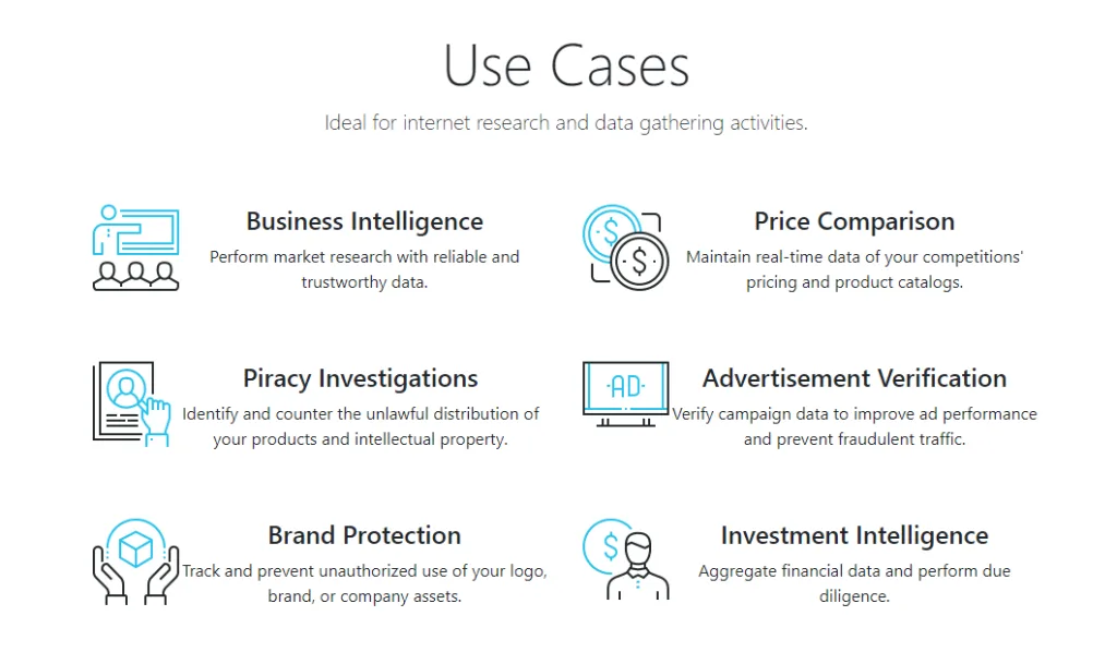 The provider sells only datacenter proxies, unlike many other companies that offer both datacenter and residential proxies. You can use its proxies for internet research and data gathering activities like price comparison, brand protection, ad verification, etc.