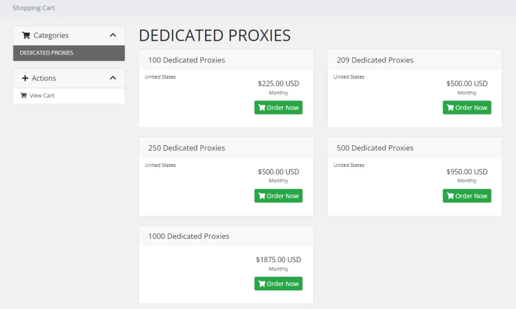 Its lowest subscription plan costs $225 for 100 US dedicated IP addresses, which is $2.25 per IP. But, the good thing is that the more proxies you buy, the cheaper they are. For example, you can get 500 US dedicated IP addresses for $950, which comes down to $1.9 per IP, or buy 1,000 US IP addresses at the price of $1,875, which means paying $1.875 per IP.