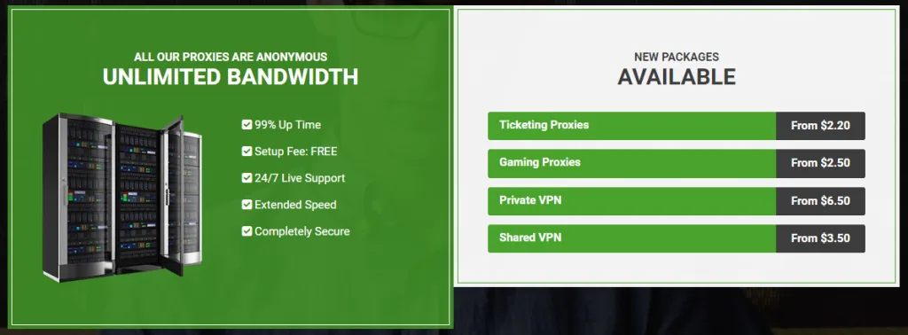 Proxy-N-VPN has three packages for its ticketing proxies. The lowest one costs $270 a month and provides you with 100 proxies. There’s a package for 250 proxies at the price of $625 a month and 500 proxies at the price of $1,100 a month.
