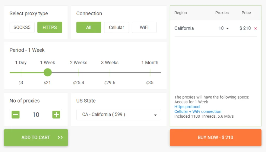 ProxyLTE pricing structure is based on the number of IPs and duration. The cost is also affected by the location of the proxies. This makes them very flexible as you can order as many proxies as you need for as long as you need, between one day and one month. But, this only applies to social and carrier proxies.