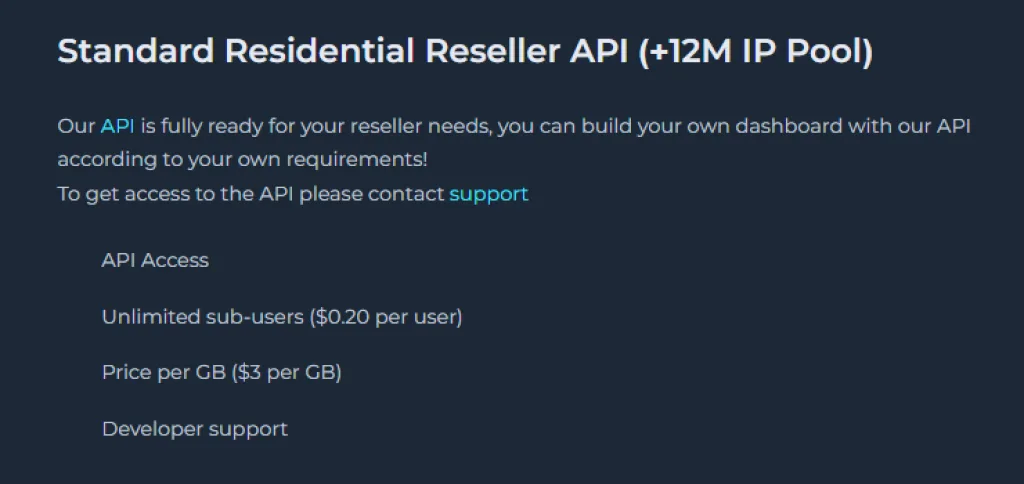 SpeedProxies offers a reseller API, which means it supports reselling its proxy services. As per the website, anyone interested in reselling residential proxies can contact the support team for access to the API dashboard. A significant advantage of this tool is that you can build your dashboard per your requirements.