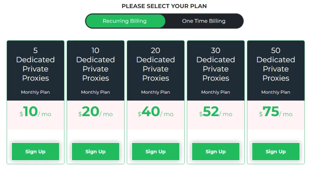 StarProxies has different plans for each category of proxies, giving its customers options to choose between recurring and one-time billing.