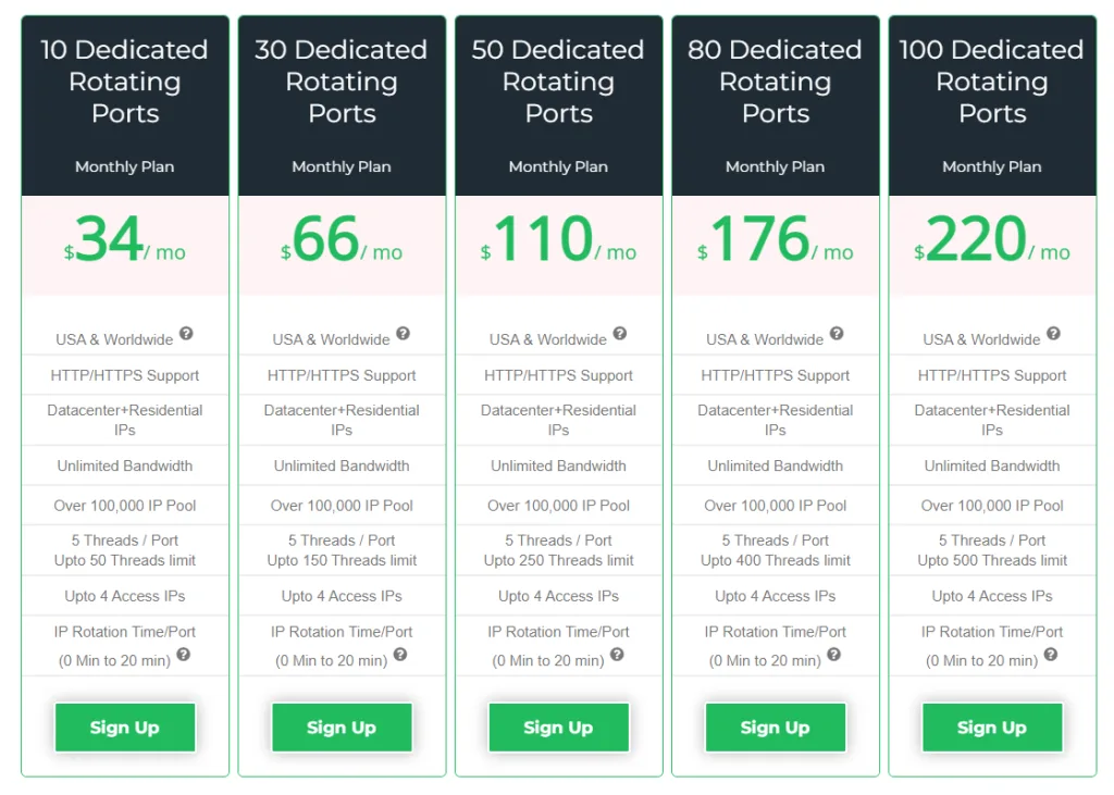 The dedicated rotating proxies are one of the most expensive proxies from StarProxies, but they provide the highest degree of online anonymity and security for tasks that require multiple IPs. The starting plan consists of 10 proxies and costs $34 a month, or $3.4 per proxy, which is quite expensive.