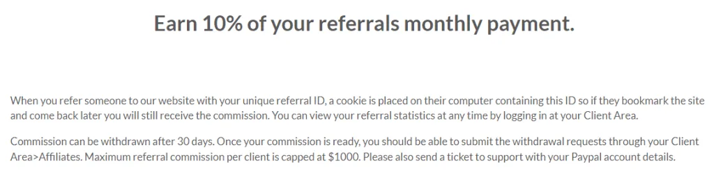 The Proxy Store offers a 10% commission on referrals. When someone visits the site through your link, they get a cookie that’s active for 30 days. Even if they get back later and make an order, you’ll get the commission. It’s important to note that the website caps the referral earnings to $1,000 per user.