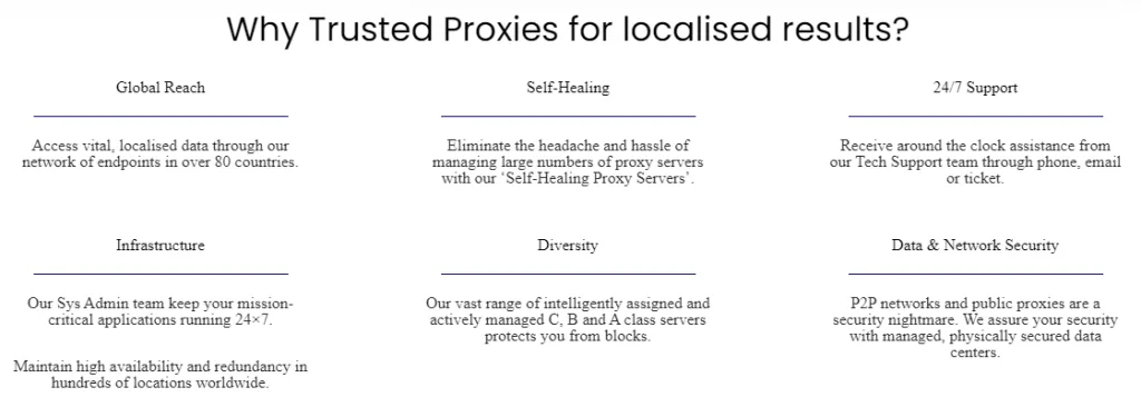 TrustedProxies certainly has some areas where it has shown prowess. In others, it falls behind its competitors. Hence, depending on your needs, you might work with this company or be forced to look for alternatives. With this in mind, below is an outline of its pros and cons.