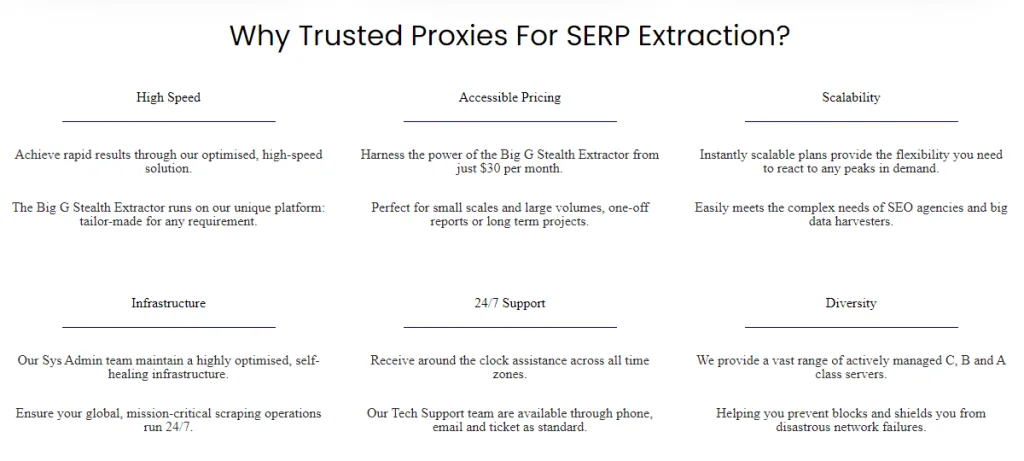 Apart from the conventional proxies, TrustedProxies also has a tool known as the Big G Stealth Extractor and the Proxy Server Cloud. In all truth, both these tools are proxies, with the only significant difference being that they are designed solely for web scraping.