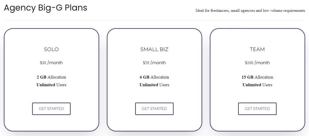 TrustedProxies has three different packages, each with different pricing. The first is the Big G Stealth Extractor. The pricing options are divided according to the customer’s needs, whether an agency or an enterprise. The cheapest option is the solo agency plan which costs $30 per month. Here you get 2 GB of bandwidth and unlimited users. As you go up the pricing plan, the bandwidth increases.