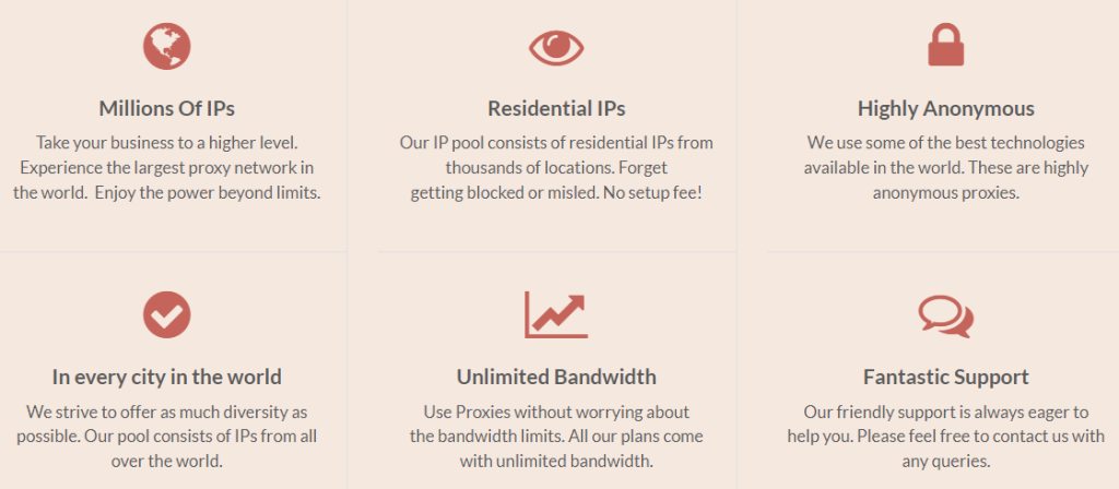 Como mencionado anteriormente, este provedor tem um catálogo limitado. Ele tem apenas suporte para proxies residenciais oferecidos em oito categorias com recursos e preços variados. Por outro lado, você obtém largura de banda ilimitada com todos os pacotes, o que é uma vantagem, pois você não precisa se preocupar com dados.