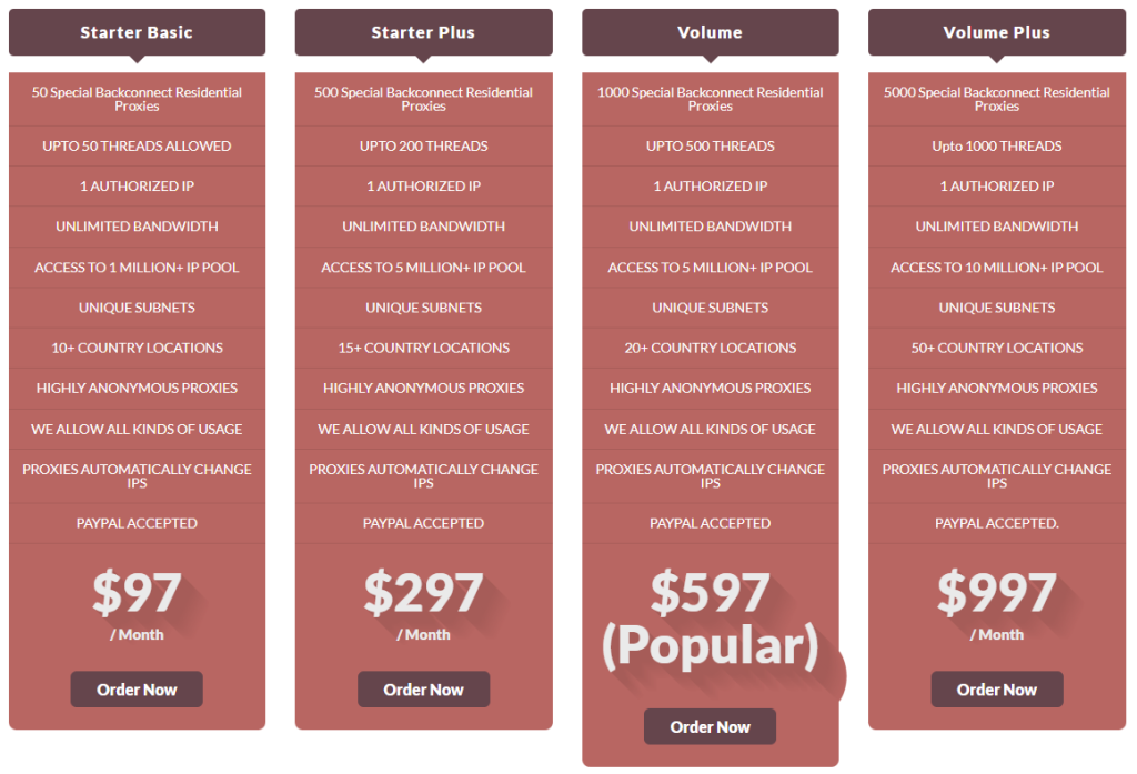 O plano mais barato, 'Starter Basic', fornece 50 proxies residenciais backconnect e 50 threads por $97 por mês. Conforme você avança de plano para plano, mais proxies você obtém. O plano mais caro é 'Power Plus', que fornece 24.000 proxies e 3.000 threads por $2.497 por mês.