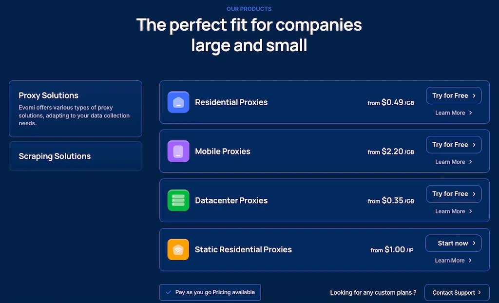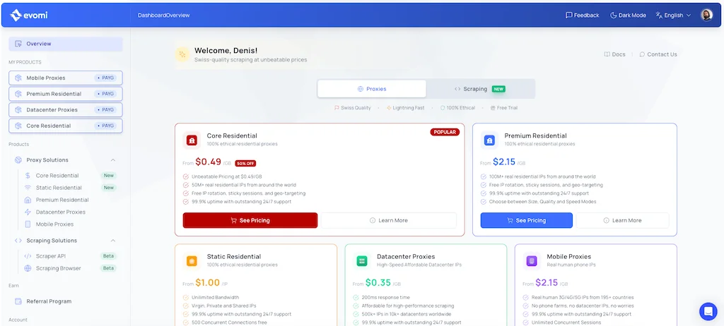 แม้ว่าจะเป็นผู้เล่นใหม่ในตลาด Evomi ได้สร้างโครงสร้างพื้นฐานที่น่าประทับใจ บริษัทนี้เสนอตัวเลือกพร็อกซี่ที่ครอบคลุม ตั้งแต่พร็อกซี่ residential และ datacenter ไปจนถึงตัวเลือก mobile และ static residential ด้านบนนั้น Evomi จัดให้มีโซลูชันการสแกรป รวมถึง Scraper API และ Scraping Browser ทำให้ตัวเองเป็นร้านเดียวสำหรับความต้องการการรวบรวมข้อมูล