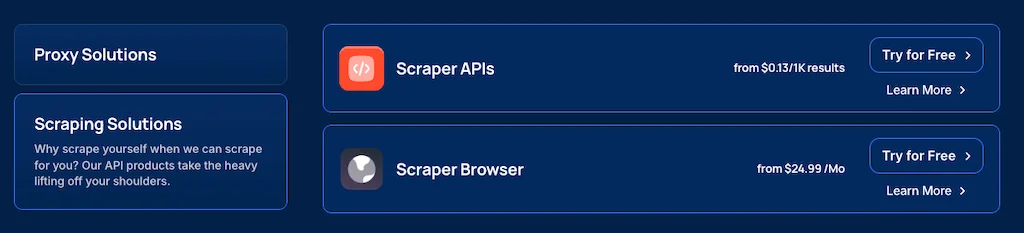 Scraper API จัดการ Cloudflare, PerimeterX, DataDome และการป้องกันบอตอื่นๆ โดยอัตโนมัติ ขณะที่ Scraping Browser รองรับเฟรมเวิร์ก Puppeteer และ Playwright สำหรับเวิร์กโฟลว์การสแกรปที่ซับซ้อนมากขึ้น