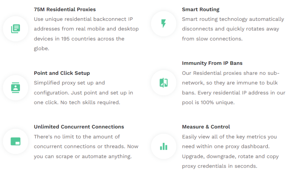 คุณสมบัติที่ผู้ให้บริการนี้มีให้อยู่นอกเหนือไปด้วยเหตุผล โดยทั่วไปแล้ว สิ่งที่เราสังเกตเห็นบริษัทนี้ทำได้ค่อนข้างดีคือการปรับปรุงตำแหน่งแพร็อกซี่ตามนั้น มันเสนอการสนับสนุนสำหรับมากกว่า 195 ประเทศ ซึ่งเกินกว่ามาตรฐานตลาดในปัจจุบัน ในความเป็นจริง เราสามารถพูดด้วยความมั่นใจว่ามีบริษัท เพียงไม่กี่บริษัทที่สามารถถึงเกณฑ์นี้ได้