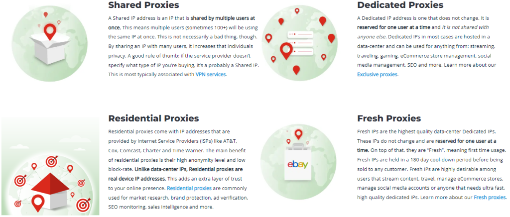 ตามที่ได้กล่าวไปแล้ว ผู้ให้บริการนี้เสนอแพร็อกซี่สองประเภท - ดาตาเซนเตอร์และที่อยู่อาศัย ควรทราบว่าแพร็อกซี่เหล่านี้มีวัตถุประสงค์ต่างกันและให้ระดับการทำงานที่แตกต่างกันขึ้นอยู่กับกรณีการใช้งาน