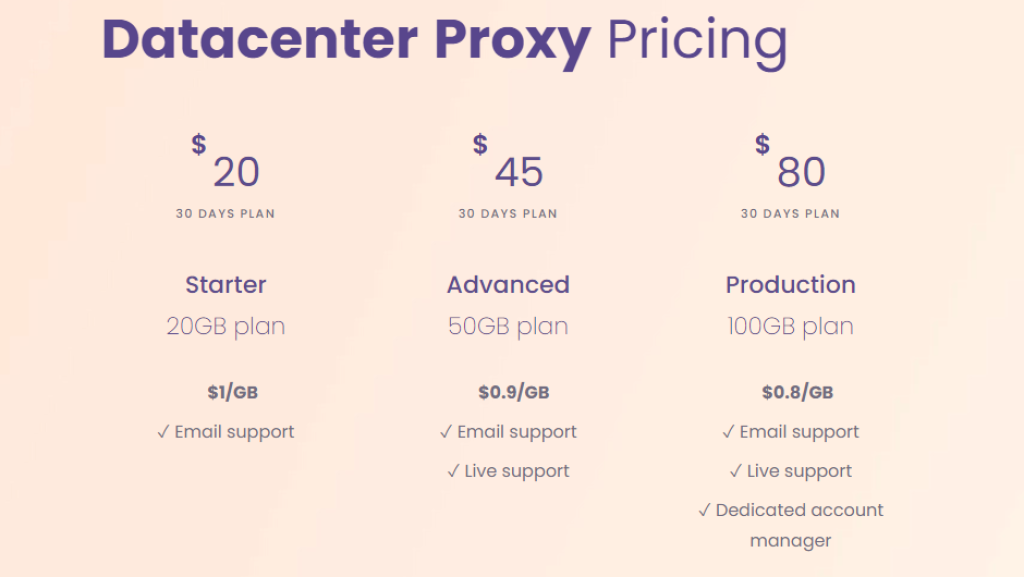 ดังนั้น หากคุณสมัครสมาชิกแผน 1 TB คุณจะจ่าย $4 ต่อ GB รูปแบบราคา proxy อื่นจะขึ้นอยู่กับคำขอ