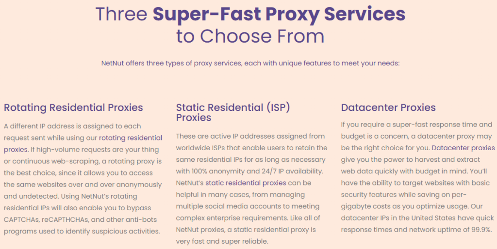 NetNut มีพร็อกซี่แบบที่อยู่อาศัยหมุนเวียน พร็อกซี่แบบ ISP แบบสแตติก พร็อกซี่แบบเปิดก็อก และพร็อกซี่ประกาศ ที่สำคัญคือ พร็อกซี่เหล่านี้มีความเร็วสูง ตัวกรองต่อประเทศที่มีความแม่นยำ และสนับสนุน SOCKS5