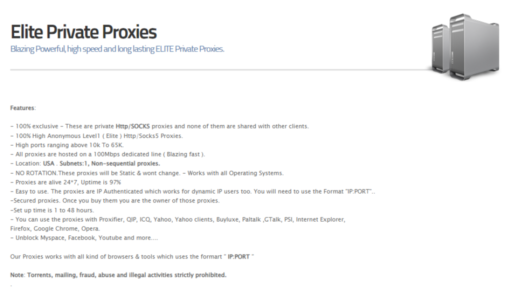 พร็อกซี่ส่วนตัวเป็นพร็อกซี่เอลีท ซึ่งหมายความว่าพวกเขาให้ระดับการเข้ารหัสลับสูงสุด พวกเขารองรับโปรโตคอล SOCKS4/5 และ HTTP และวิธีการรับรอง IP authentication เท่านั้น พวกเขาเป็นพร็อกซี่ datacenter static เนื่องจากผู้ให้บริการนี้ไม่มีพร็อกซี่หมุนเวียน