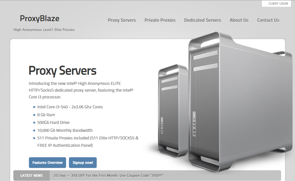 ก่อตั้งในปี 2010 ProxyBlaze ดูเหมือนว่าได้ให้บริการ US private proxies และ dedicated proxy servers มากกว่าทศวรรษ ระดับการเข้ารหัสลับสูง 1 หรือพร็อกซี่เอลีทของมันส่วนใหญ่ถูกซื้อและใช้โดยธุรกิจขนาดเล็กถึงกลาง