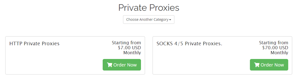 ตัวอย่างเช่น 10 HTTP private proxies ราคา 10 ดอลลาร์ต่อเดือน และราคาเดียวกันนี้ใช้ได้กับ 10 SOCKS private proxies แพคเกจเดียวที่มีพร็อกซี่แพงกว่า 1 ดอลลาร์ต่อพร็อกซี่คือแพคเกจที่ต่ำสุด ประกอบด้วย 5 พร็อกซี่ราคา 7 ดอลลาร์