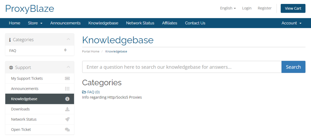 เราส่งอีเมลให้พวกเขาเพื่อค้นหาข้อมูลให้มากที่สุดเท่าที่เป็นไปได้และได้รับการตอบสนองจากพวกเขาภายใน 24 ชั่วโมง ดังนั้นหากคุณต้องการการสนับสนุนอย่างรวดเร็ว คุณส่วนใหญ่จะไม่ได้รับจาก Proxy Blaze อย่างไรก็ตาม พวกเขามีส่วน FAQ และฐานความรู้ ซึ่งเห็นได้ชัดว่างเปล่า และประกาศล่าสุดจากทีมถูกสร้างขึ้นย้อนกลับไปในปี 2014