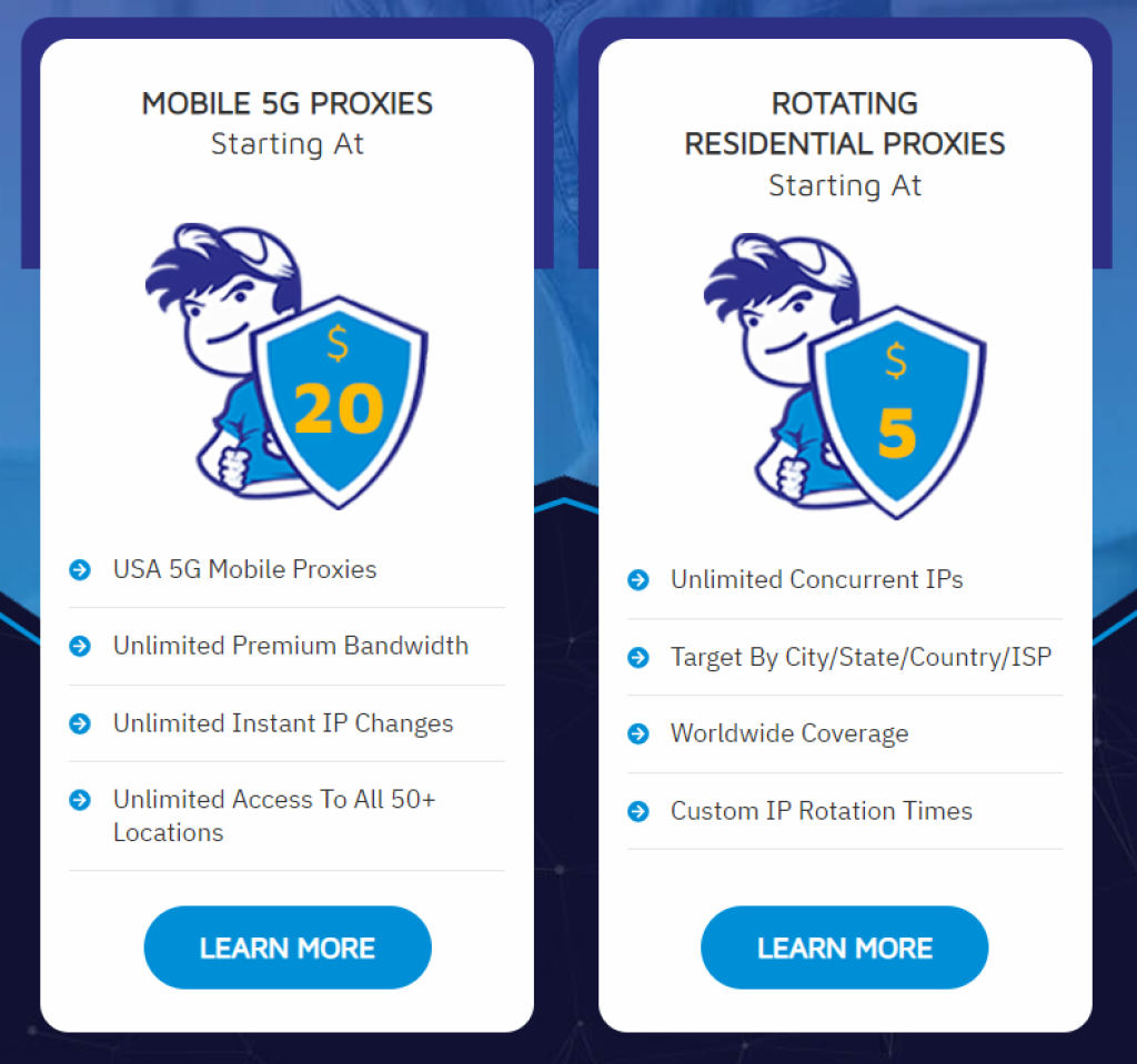 ProxyGuys เป็นที่รู้จักในการเชี่ยวชาญในพร็อกซี่ 5G มือถือที่ใช้ในสหรัฐอเมริกา ตัวเลือกการสมัครสมาชิกทั้งหมดสำหรับแผนพร็อกซี่มือถือรวมถึงการเข้าถึงที่ไม่จำกัดสำหรับสถานที่สหรัฐอเมริกา 26 สถานที่ของพวกเขาและการเปลี่ยน IP ทันทีที่ไม่จำกัด คุณยังได้รับการเข้าถึงแบนด์วิดท์พรีเมียมที่ไม่จำกัด