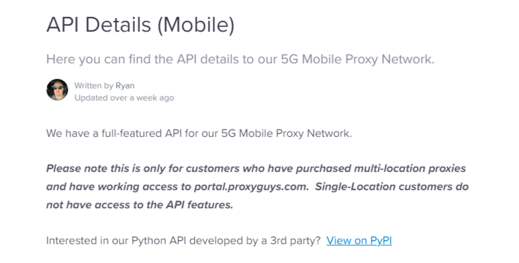 ProxyGuys ยังมีเครื่องมือ API สำหรับลูกค้าพรีเมียม บริษัททำการโฆษณาขั้นต่ำในซอฟต์แวร์นี้ ในความเป็นจริง มันจะใช้เวลานานก่อนที่คุณจะได้รับรายละเอียด API จากเว็บไซต์หลัก เนื่องจากมีเพียงลูกค้าที่ซื้อแผนพร็อกซี่ 5G มือถือแบบหลาย ๆ ที่