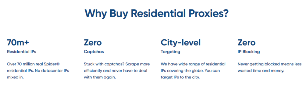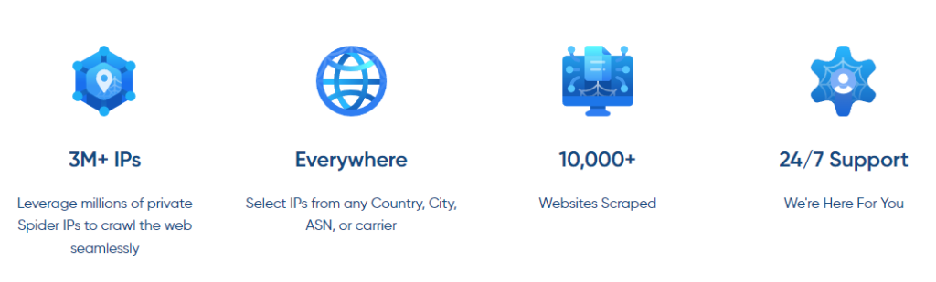 Spider Proxy เป็นผู้ให้บริการพร็อกซี่เชิงพื้นที่ที่ไม่ได้มีมาตั้งนานนัก มุ่งเน้นไปที่พร็อกซี่เชิงพื้นที่สำหรับการเก็บข้อมูลจากเว็บ แต่ยังมี crawler แบบเรียลไทม์ด้วย เมื่อคุณเข้าไปที่เว็บไซต์ของบริษัทนี้ คุณจะเห็นว่าพวกเขาได้ทำให้บริการพร็อกซี่นี้ดูเหมือนเป็นบริการที่ดีที่สุดในตลาด