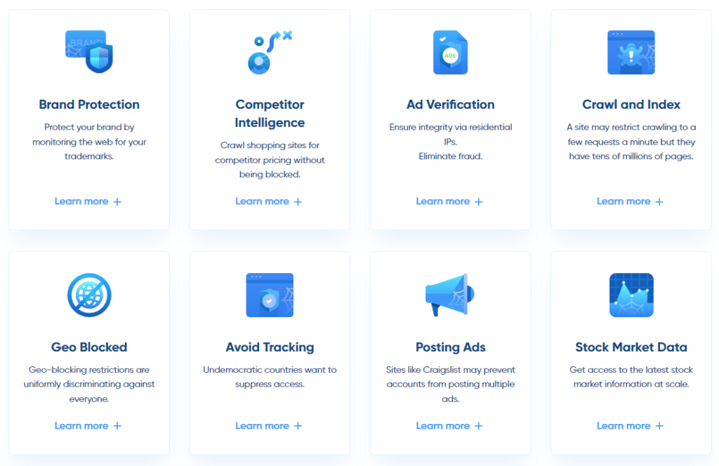 นอกจากการเก็บข้อมูลจากเว็บแล้ว คุณยังสามารถใช้พร็อกซี่สำหรับการป้องกันแบรนด์ การตรวจสอบโฆษณา การรวบรวมข้อมูลคู่แข่ง การโพสต์โฆษณา การหลีกเลี่ยงการจำกัดตามภูมิศาสตร์ การตรวจสอบ SEO การรวบรวมข้อมูลการท่องเที่ยว และการวิจัยตลาด