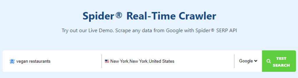 นอกจากพร็อกซี่แล้ว Spider Proxy ยังขายเครื่องม้วน crawler แบบเรียลไทม์ ก่อนที่คุณจะซื้อ คุณสามารถลองใช้ live demo ของมันและขูดข้อมูลใดก็ได้จาก Google ด้วยฟรี ผลิตภัณฑ์นี้ยังมีการทดลองใช้ฟรี 14 วัน เพื่อให้คุณสามารถใช้แยกข้อมูลเว็บได้มากเท่าที่คุณต้องการ