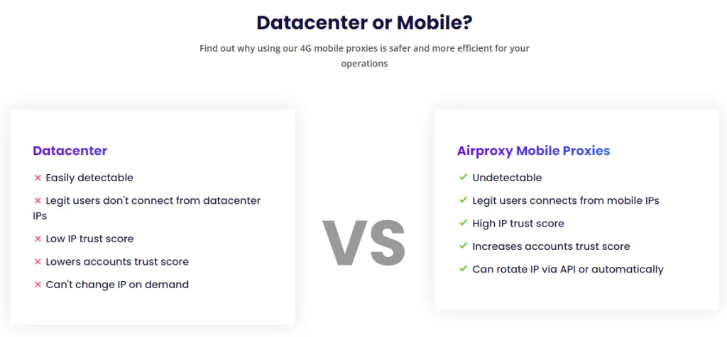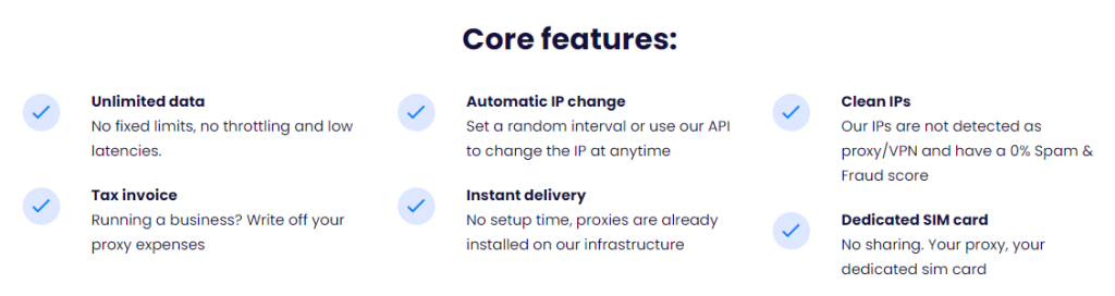 Airproxy'yi diğer mobil proxy sağlayıcılarından ayıran şey, onun abonelik için özel bir SIM kartı kullanılmasıdır. Bu, proxy'lerini rakiplerinin sunduğundan çok daha temiz hale getirir. Ayrıca, şirket kendi ağına sahip olup başka şirketlerle paylaşmadığından, daha hızlı proxy'ler sunabilir. Ayrıca sınırsız bant genişliği ve otomatik IP değişimi ile gelirler.