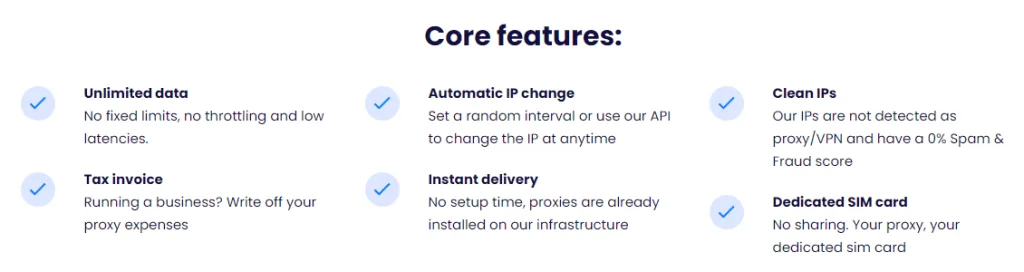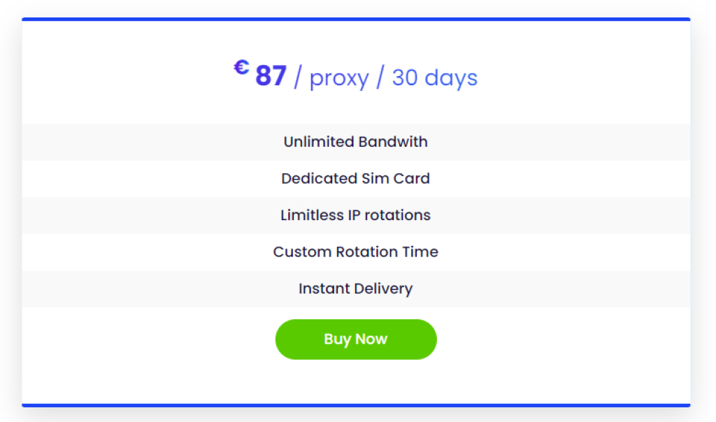 İyi tarafında, çok basittir. Şirketin ayda bir proxy için 87€ (yaklaşık $92) sunduğunu görebilirsiniz ve bununla gelen onun şey. Buna özel bir SIM kartı, sınırsız bant genişliği, özel döndürme süresi, sınırsız IP rotasyonları ve anında teslimat dahildir.