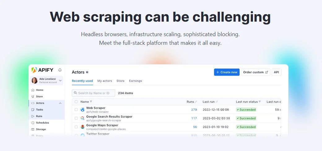 Apify bir proxy sağlayıcısından çok daha fazlasıdır. Web scraping, veri çıkarma ve browser otomasyonu için çok sayıda araç sunmaktadır. Şirketin kataloğundaki en popüler ürünlerin bazıları hazır kaydırıcıları, Crawlee adlı açık kaynak web scraping kütüphanesini, zaman alıcı sunucusuz işler için oyuncuları, kod şablonlarını vb. içermektedir.