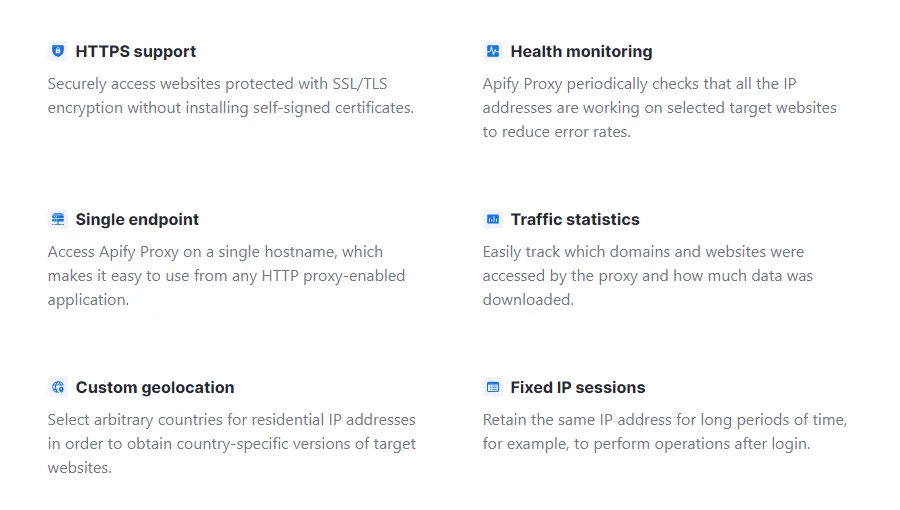 Proxy'ler Apify'nin önemli ürünü olmasa da, güvenilir dönen HTTPS proxy sunucuları arıyorsanız yine de dikkate alınması gereken bir seçenektir. Web scraping ve otomasyonu göz önüne alınarak geliştirilmişlerinden beri, tespit ve yasaklardan kaçınmanıza yardımcı olacak hemen hemen onun sistem ile kullanabilirsiniz.