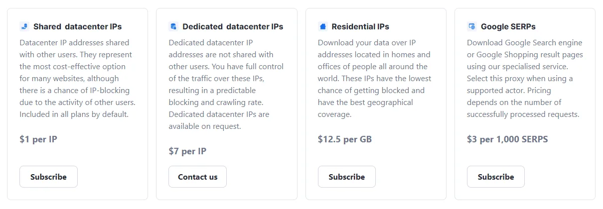 Apify, konut ve veri merkezi proxy'lerini üç versiyonda sunmaktadır: paylaşılan veri merkezi, dedicat veri merkezi ve konut (dönen) IP'ler. Ayrıca, yalnızca Google Arama, Google Alışveriş ve Google Alışveriş Araması için kullanılabilen Google SERP proxy'leri de sunmaktadır; bu nedenle bunları diğer web siteleri için kullanamazsınız.