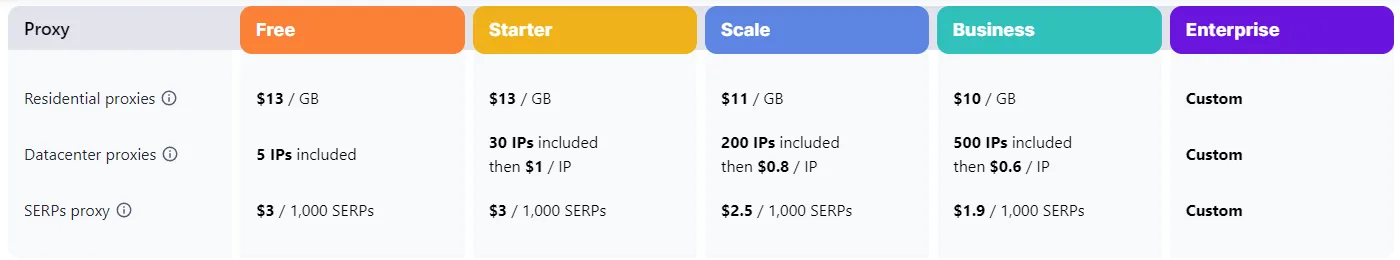 Dedicat veri merkezi proxy'leri istiyorsanız, satış ajanlarına iletişim kurmanız gerekecektir. Bu proxy'ler IP başına $7'ye mal olmakta; bu oldukça pahalıdır. SERPs proxy'leri döndürülen SERPs sayısı tarafından ücretlendirilmekte olup 1.000 SERP başına $3'ten başlamaktadır.