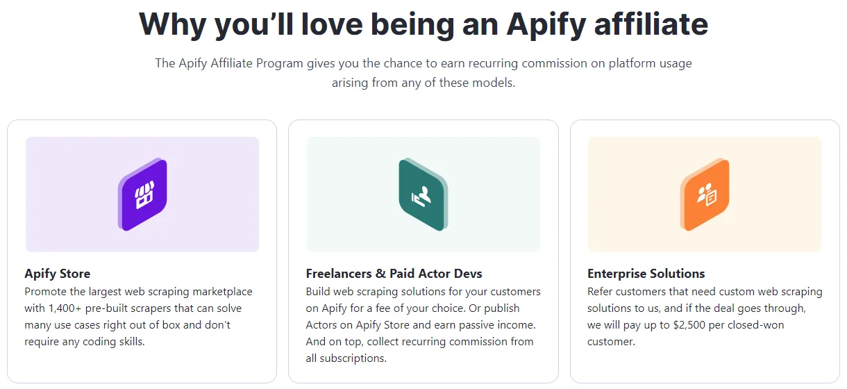 Apify, yüzde 30'a kadar yinelenen komisyon kazanmanıza izin veren bir ortaklık programına sahiptir. Program geliştiriciler ve serbest çalışanlar, eğitmenler ve eğitimciler, dijital acenteler, endüstri etkileyicileri, içerik oluşturucular ve teknoloji toplulukları için forum yöneticileri için uygun olmaktadır.