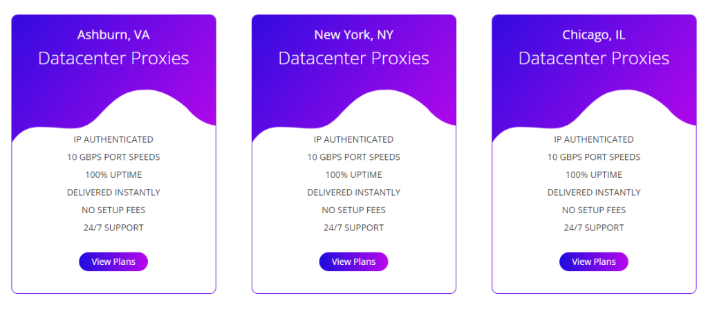 Bu şirket, 3 günlük bir plan seçerseniz veri merkezi proxy başına 1 $ ile başlayan uygun fiyatlı proxy’lere sahiptir. Ayrıca aylık, 2 aylık ve 3 aylık veri merkezi proxy planlarına sahiptir ve size aralarından seçim yapabileceğiniz üç seçenek sunmaktadır: Ashburn, COXISP ve FreshISP proxy’leri.