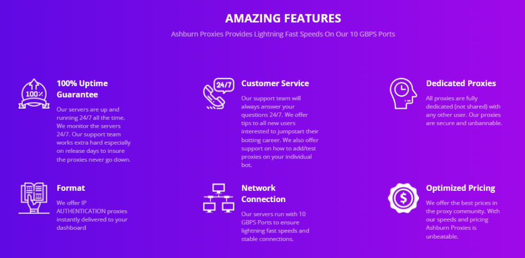 Ashburn Proxies, ayakkabı satın alma için oldukça uzmanlaşmış ISP proxy'leri sunan meşru bir proxy sağlayıcısıdır. Para iadesi politikası olmasa da, şirket tüm sunucularını teslim etmeden önce test etmekte ve ping göndermektedir.