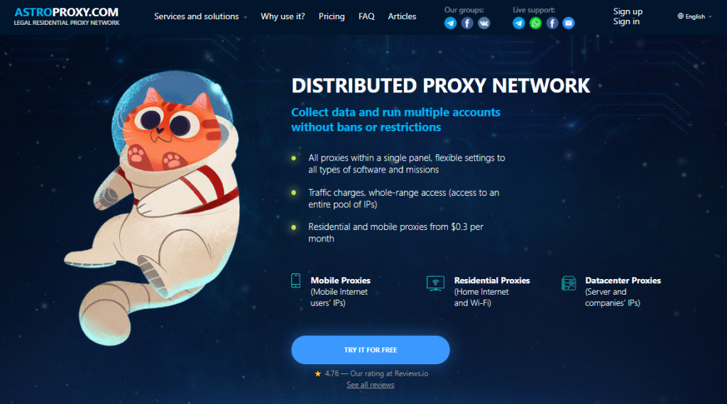 Astroproxy, yüksek hızlara ihtiyaç duymayan görevler için ucuz konut, veri merkezi veya mobil proxy'lerine ihtiyacınız varsa harika bir proxy sağlayıcısıdır. İyi bir ücretsiz deneme sürümü ve esnek ödeme seçeneklerine sahip olduğundan, proxy ihtiyaçlarınız ve bütçeniz için mükemmel bir plan oluşturabilirsiniz.