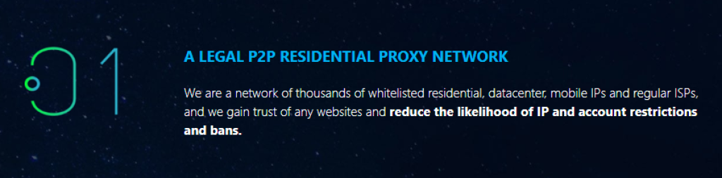 Birçok proxy sağlayıcının yasadışı kaynaklı IP adreslerine güvendiğini ve bunların bazılarının Astroproxy'den daha ünlü olduğunu öğrenince şaşıracaksınız. Ancak bu marka ile endişelenmenize gerek yoktur çünkü yasal bir P2P konut proxy ağına sahip olup etik olarak kaynak gösterilen IP'ler sağlamaktadır. Bu uygulama çok önemlidir çünkü minimum hesap kısıtlaması ve yasaklanma riski ile IP'ler kullanacağınız anlamına gelmektedir.