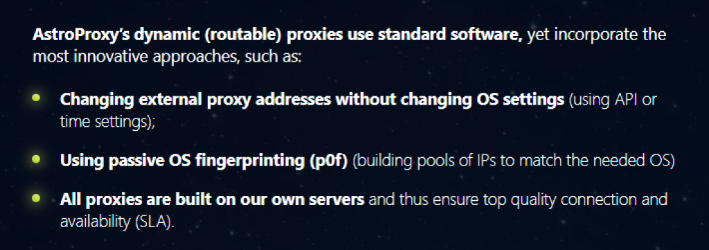 Ayrıca, hiçbir veri merkezi IP'si birden fazla kullanıcı ile paylaşılmaz, bu nedenle Astroproxy veri merkezi IP'lerinizin tek kullanıcısı olduğunuzdan emin olabilirsiniz. Bunları ortalama düzeyde anonimlik ve güvenlik gerektiren görevler için kullanabilirsiniz.