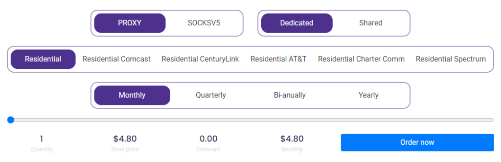 Web sitesinden proxy satın almak komplike değildir. Yapmanız gereken tek şey, ana web sitesinden farklı paketlerde gezinmek ve "Şimdi sipariş ver" düğmesine basmaktır. Oradan, mevcut tüm paketlerin bulunduğu panoya erişeceksiniz. Hizmet için kaydolmadıysanız, yalnızca e-postanız, kullanıcı adınız ve şifreniz sağlamanız gerekir.