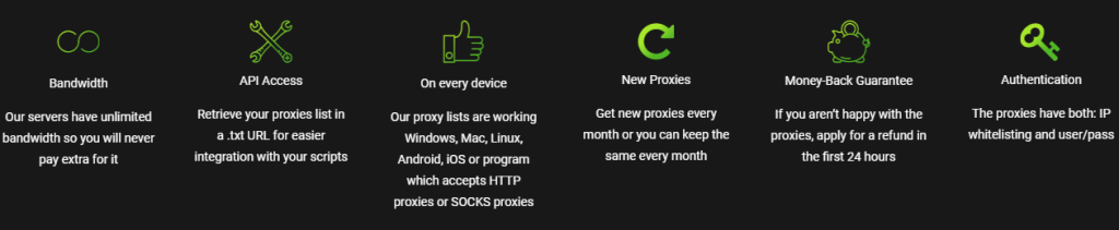 Yasaklandığınız hakkında endişelenmenize gerek yoktur çünkü bu proxy'ler onun 30 günde bir değişir. Ayrıca uygun fiyatlardaki HTTPS ve SOCKS5 protokollerini desteklemektedirler.