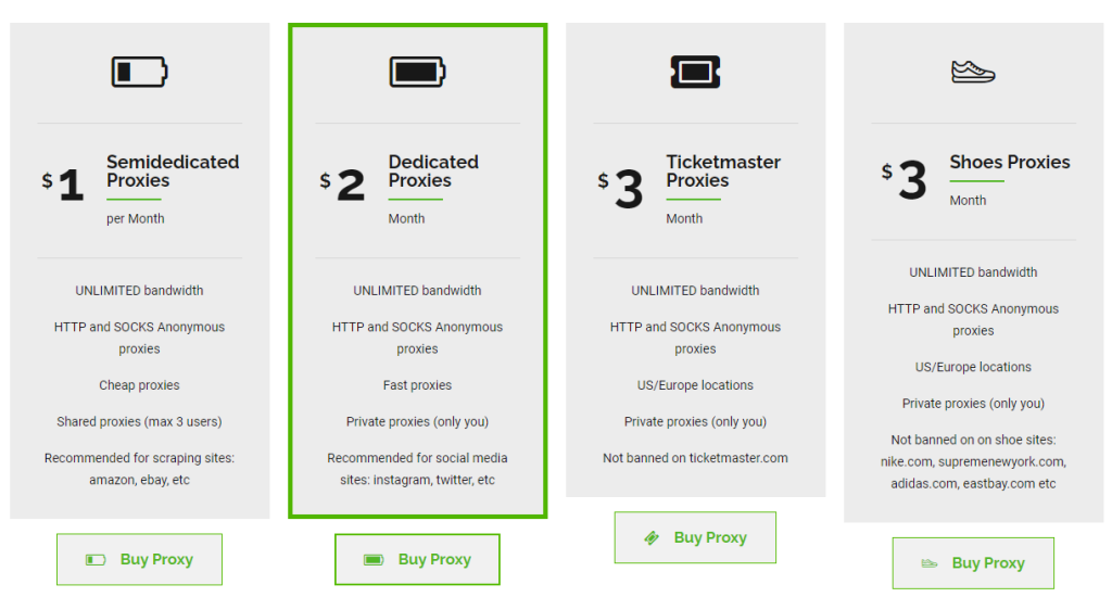 BuyProxies'ten bulunan proxy'ler dört farklı kategoriye ayrılmıştır: yarı adanmış proxy'ler, adanmış proxy'ler, Ticketmaster proxy'leri ve ayakkabı proxy'leri. Bu proxy'lerin farklı fiyatlandırma planlarına düşüklüğünü değil almalısınız.