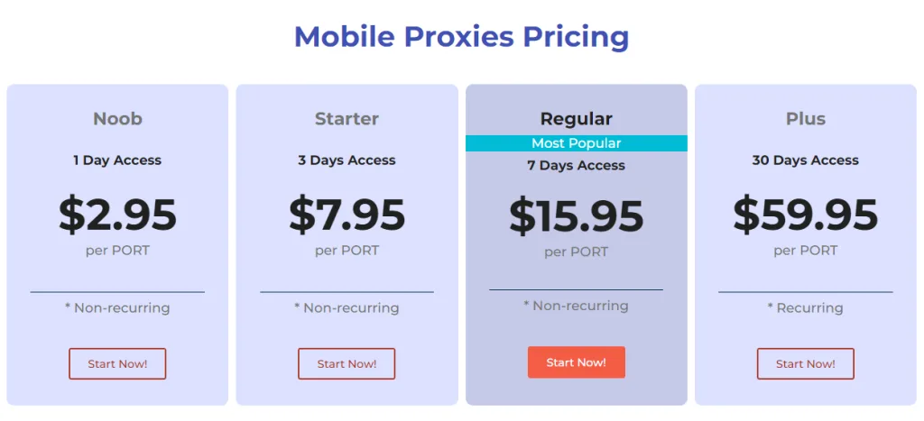 Şirket, sınırsız bant genişliği ve aylık taahhüt olmaksızın gelen 200.000'den fazla mobil proxy sunmaktadır ve 4G mobil proxy'ler ve mobil statik proxy'ler bulunmaktadır. 4G mobil proxy havuzu, yalnızca saygın mobil operatörlerinden IP adreslerini içerir ve bu da maskelemeyi, kısıtlamayı veya suistimal bloklamalarını önler.