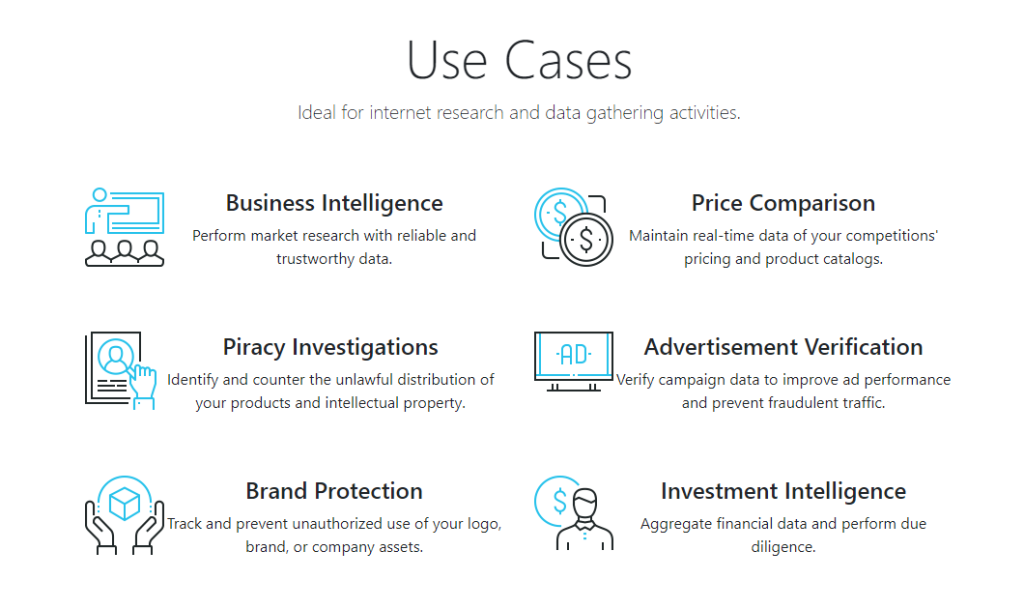 Sağlayıcı sadece veri merkezi proxy'leri satar; birçok diğer şirketin aksine hem veri merkezi hem de yerleşim tipi proxy'ler sunar. Proxy'lerinizi internet araştırması ve fiyat karşılaştırması, marka koruması, reklam doğrulama vb. gibi veri toplama etkinlikleri için kullanabilirsiniz.