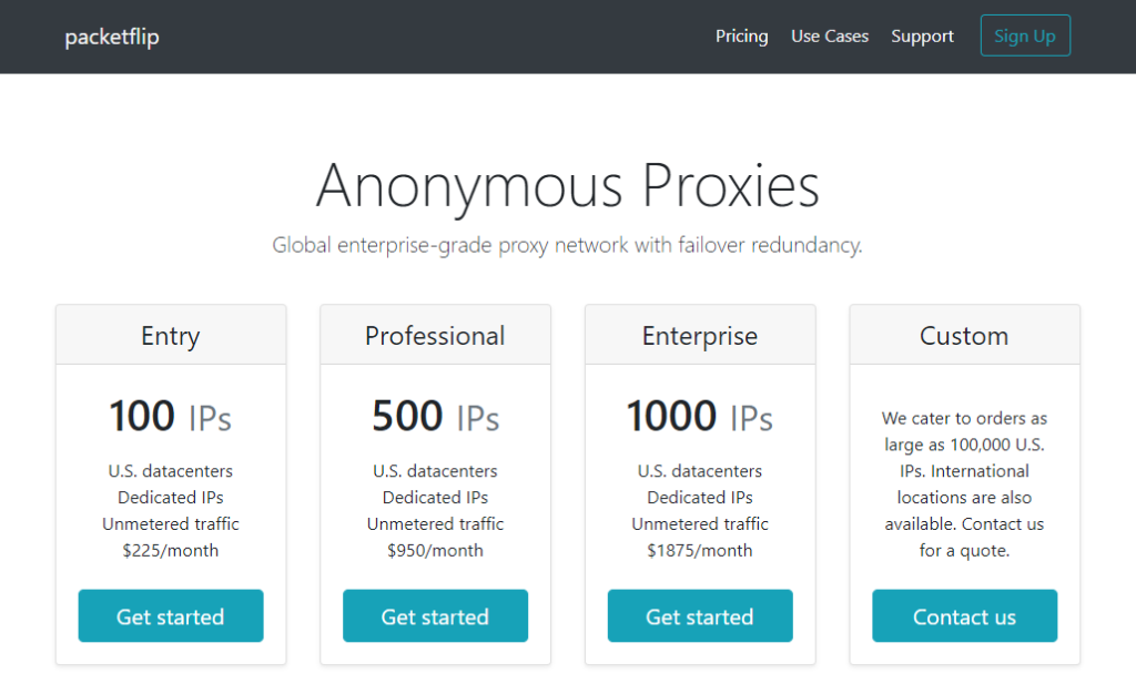 Packetflip, dünya çapında proxy kullanıcılarına ABD özel proxy'leri sunan meşru bir proxy sağlayıcısı gibi görünmektedir. Sağlayıcı hakkında çok sayıda inceleme bulamadık olsa da, onun şey meşru görünmektedir.