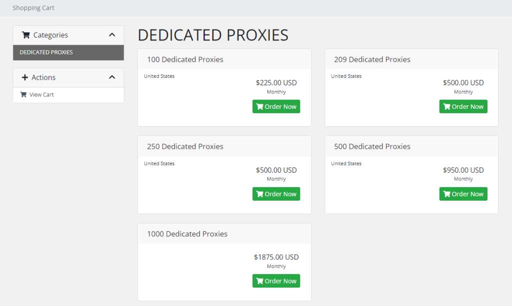 En düşük abonelik planı 100 ABD özel IP adresi için 225 dolar tutar; bu, IP başına 2,25 dolar demektir. Ancak iyi taraf, daha fazla proxy satın aldıktan ne kadar ucuzlar olmasıdır. Örneğin, 500 ABD özel IP adresi için 950 dolar alabilir, bu da IP başına 1,9 dolar düşer veya 1.000 ABD IP adresi satın alıp IP başına 1,875 dolar ödeyebilirsiniz.