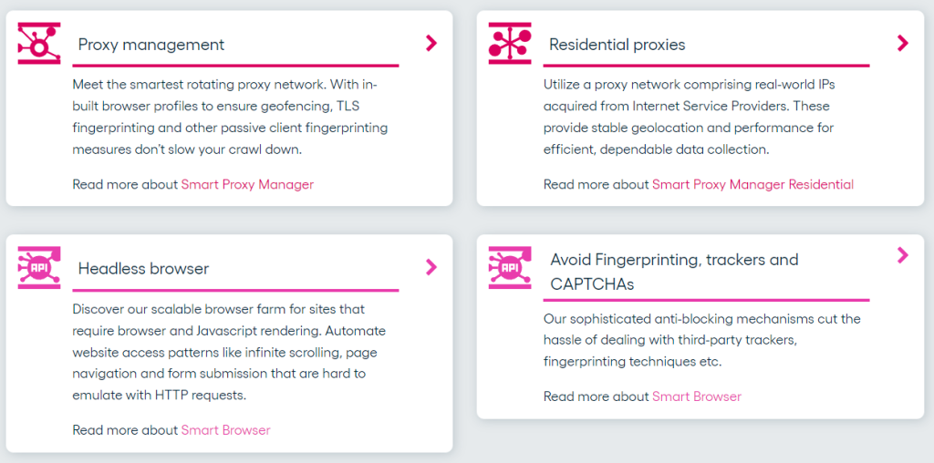 Zyte sadece bir proxy hizmeti değildir. Web kazıması için özel olarak oluşturulan Smart Proxy Manager, Scrapy ve Otomatik Çıkarma dahil olmak üzere birçok ürüne sahip bir markadır. Şirket, eski adıyla Scrapinghub olarak biliniyordu, ancak 2021'de resmi olarak Zyte oldu.