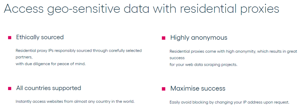 Marka konut IP'lerini de sunmaktadır, ancak bunları bağımsız bir ürün olarak ele almaz. Bunun yerine, aktif abonelere ücretli bir eklenti olarak sunmaktadır. Konut proxy'leri veri merkezi proxy'lerinden daha güvenli ve anonim ve güvenilir olduğundan, coğrafi olarak kısıtlanmış web sitelerini kazımak için bunlar için ekstra para ödeyebilirsiniz.