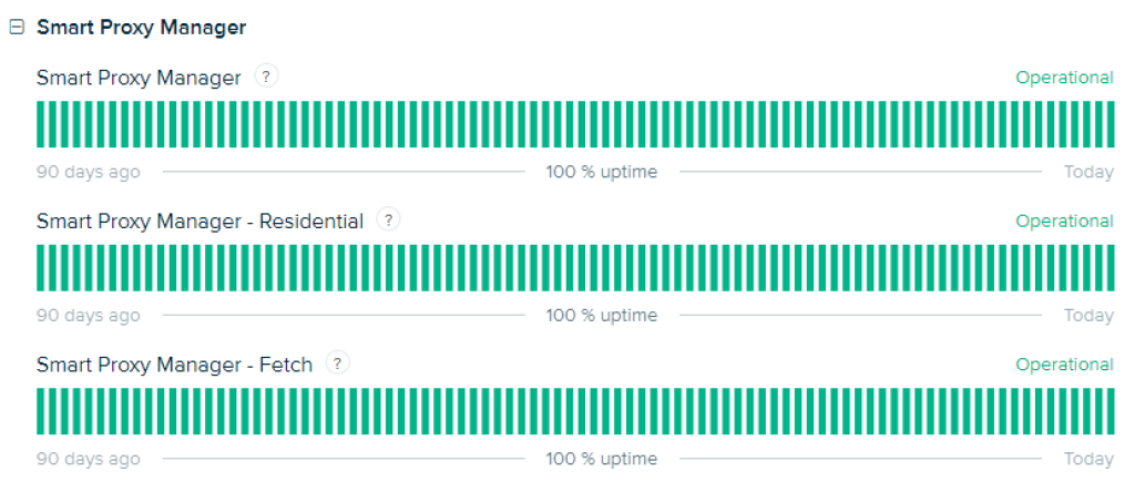 Zyte Smart Proxy Manager, son üç ayda %100 çalışma süresi sunmakta, bu da aldığınız proxy'lerin son derece güvenilir olduğu anlamına gelir.